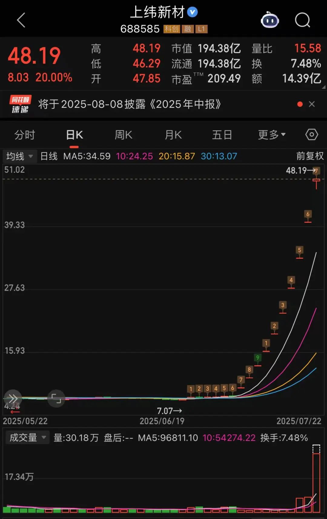 今天上午,上纬新材再度“20CM”涨停,迎来10连板,10个交易日累计涨幅超519%,最新市值为194.4亿元。