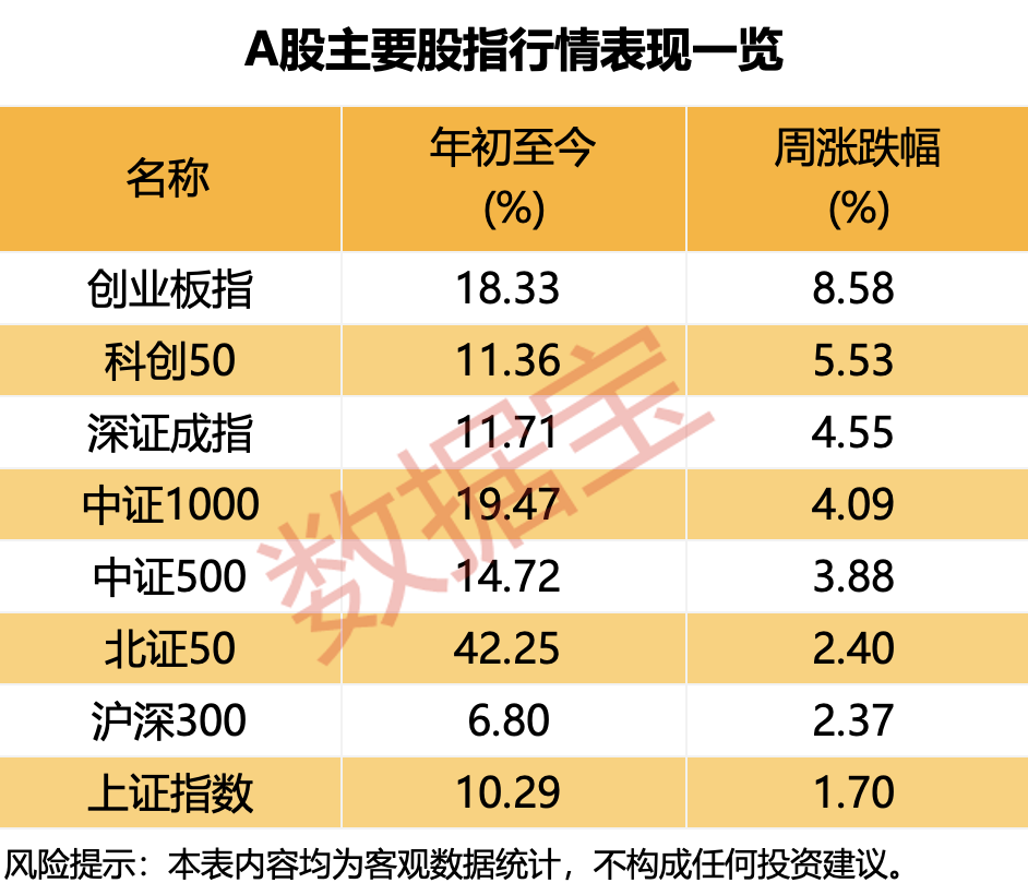 指数方面,周内沪指一度站上3700点关口,最新报3696.77点,周涨幅1.7%;深证成指上涨4.55%,创业板指大幅上涨8.58%。