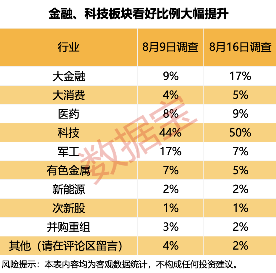 对于下周A股市场的潜力板块和方向选择,大金融板块环比暴涨8个百分点至17%,是受访者最为看好的板块;科技板块随后,看好比例上涨6个百分点至50%。军工板块则大幅下滑10个百分点,最新为7%。