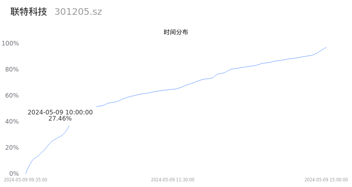 301205联特科技2024年05月09日成交1.86万手,成交金额1.50亿元,相较昨日缩量4607手,换手率2.74%,成交清淡。