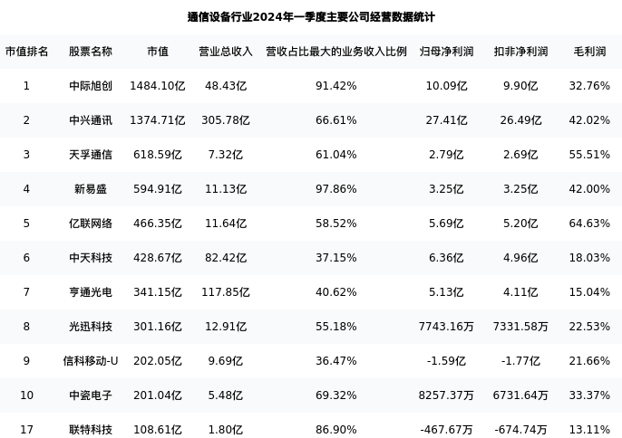 联特科技最新报告期数据为一季度,下表汇总了通信设备行业内市值靠前的公司一季度主要经营数据