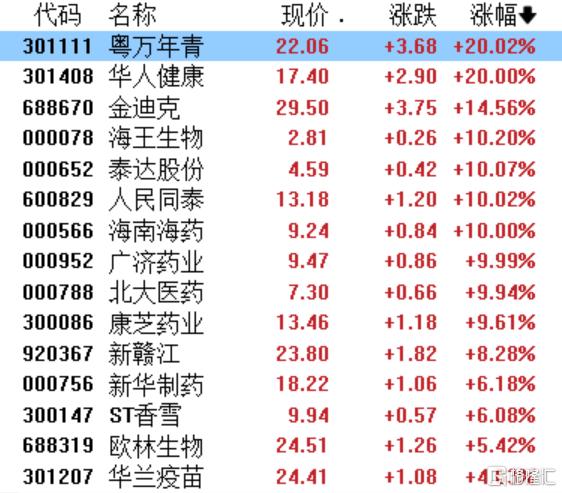 其中,抗流感概念股中,粤万年青、华人健康20cm涨停,金迪克涨超14%,海南海药广济药业北大医药涨停,特一药业新华制药华兰疫苗跟涨。