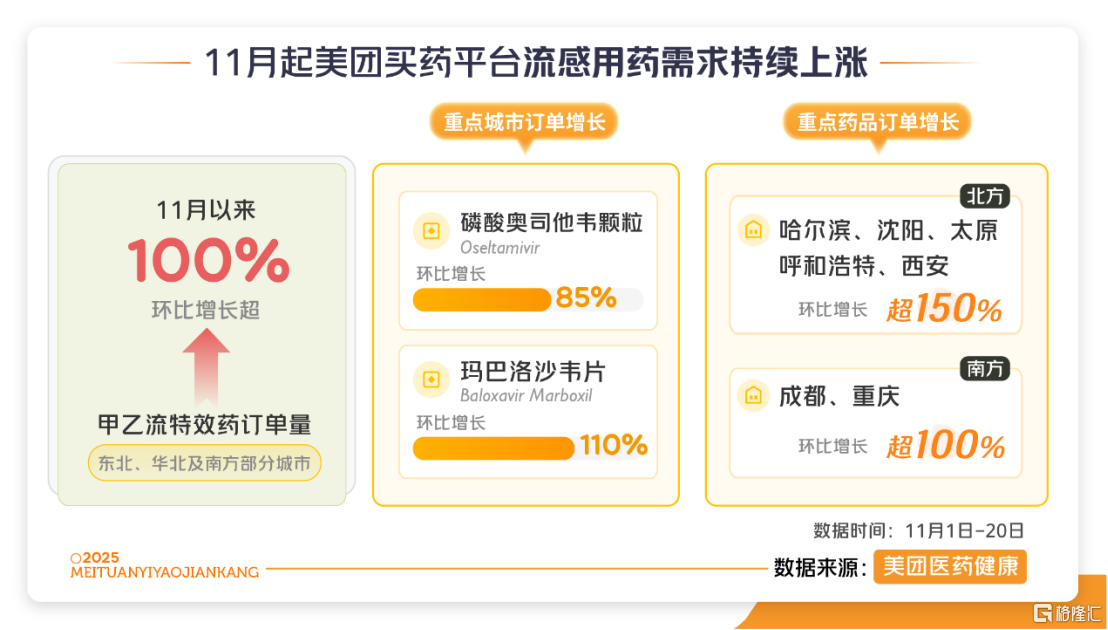 美团买药平台数据指出,11月以来北京甲乙流特效药环比增长超130%。其中,速福达增长超110%,磷酸奥司他韦颗粒增长超85%。