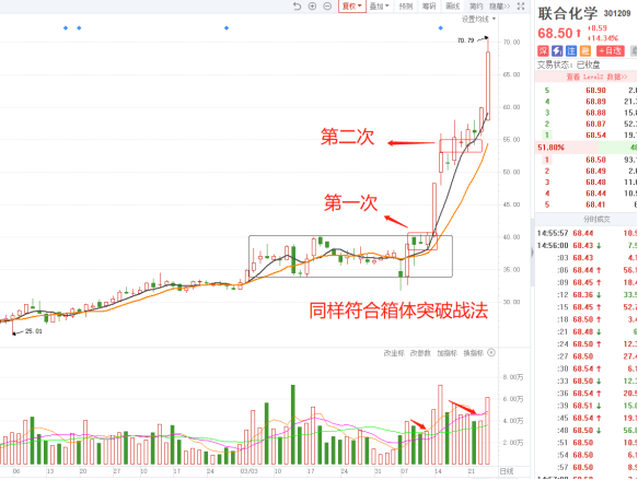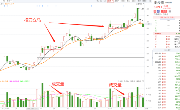“横刀立马”战法与箱体突破战法是不同的,箱体要求K线的实体在一个箱体之内,且幅度较大,买点为大阳线突破的当天。而“横刀立马”战法不是,它是一种在良性蓄势中,逢低潜伏的一种方法,某种程度上,它更讲究一种投资的性价比。(1)阴线买入,一定要等到10日均线作为支撑线的时候再买入;(3)最好是相对底部突破的股票成功率高,同样也适合周K线与月K线中的走势形态;(4)在股价下跌到一定阶段的时候,要考虑止损,盘整的时间不应该超过14天,超过就应该止损出局,跌破10日均线的时候要止损,反抽也要止损。联合化学在横盘一段时间之后,开始尝试往上突破。在2025年4月9号左右出现了横刀立马的形态,此形态伴随着成交量的放大,主力资金涌入,最终强势拉起了一波主升浪。步步高在去年10月开始,向上连板后出现了横刀立马的平台整理,同时成交量也是一个立桩量形态,后市必然是上涨的一只黑马股票,此时是一个买入点的位置,投资者可以积极的介入。在该位置介入之后,继续观察该股的走势,在上涨的中期阶段该股再次出现了一个横刀立马的平台整理;最关键的是风险小,利润高!一旦出现在周K或月K上,则为中长线大牛股!每日将涨幅榜第一榜保存在自选股中观察即可,一般,一周之内即可出现“横刀立马”的股票。智算龙头中电鑫龙在今年2月18-2月24日,曾今走出横刀立马的走势。当时股价经历一波20%的拉升后,确立强度,然后横盘整理5天时间,整理期间缩量,股价温和回撤至10日线并得到承接,由此出发横刀立马结构,此后该股经历一波超过30%的再度拉升。
