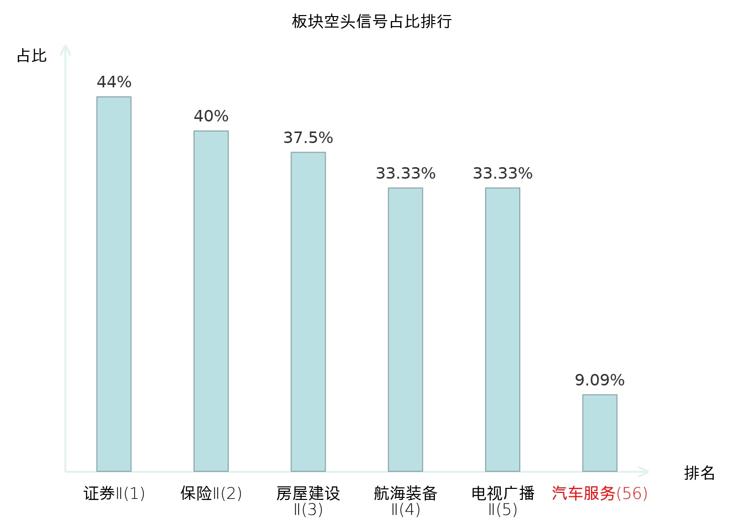 全市场所有行业板块中主力空头信号占比排名中,证券Ⅱ板块位居第一。证券Ⅱ板块名次提升最快,较昨日上升125位。