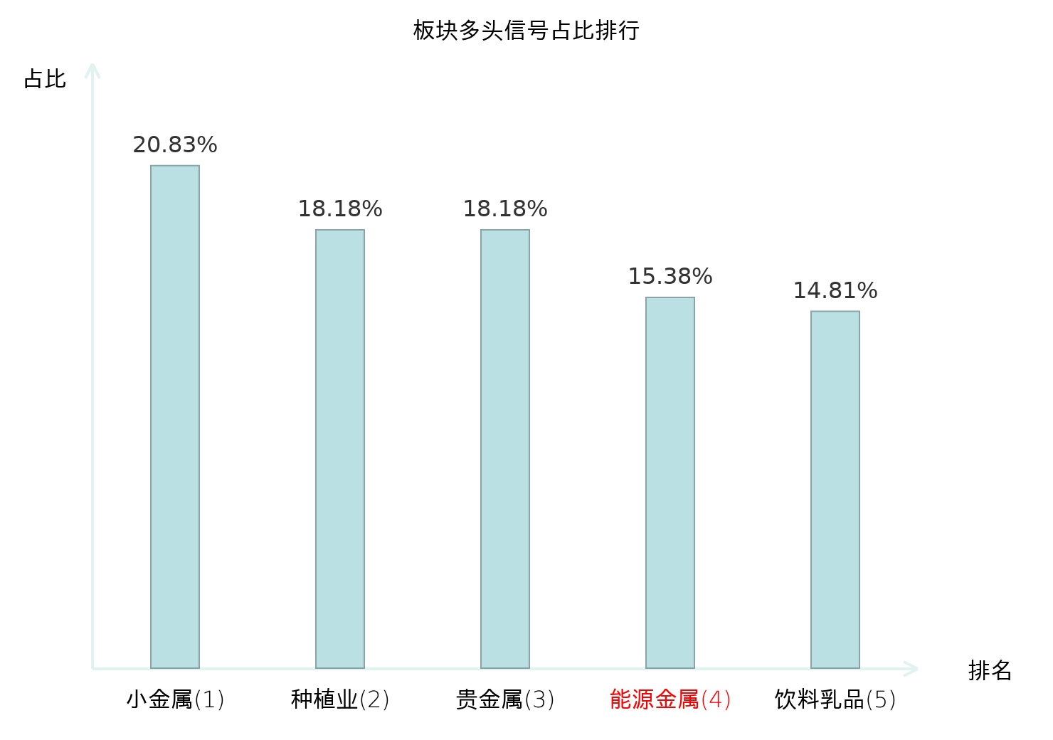全市场所有行业板块中主力多头信号占比排名中,小金属板块位居第一。房屋建设Ⅱ板块名次提升最快,较昨日上升111位。
