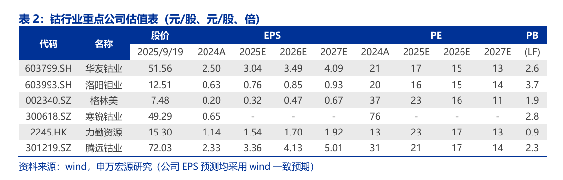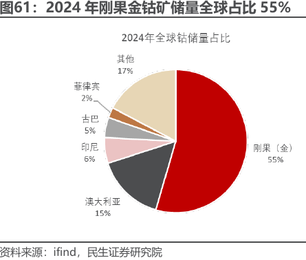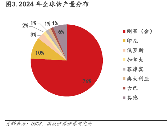 钴行业:刚果(金)迎来政策调控,钴供需或迎来反转。全球钴供应75%来自刚果(金)。USGS统计,2024年全球钴产量29万金属吨,同比增长22%。其中刚果(金)为第一大产出国,产量22万金属吨,占比75%;印度尼西亚产量2.8万金属吨,占比9%;俄罗斯产量8700金属吨,占比3%。