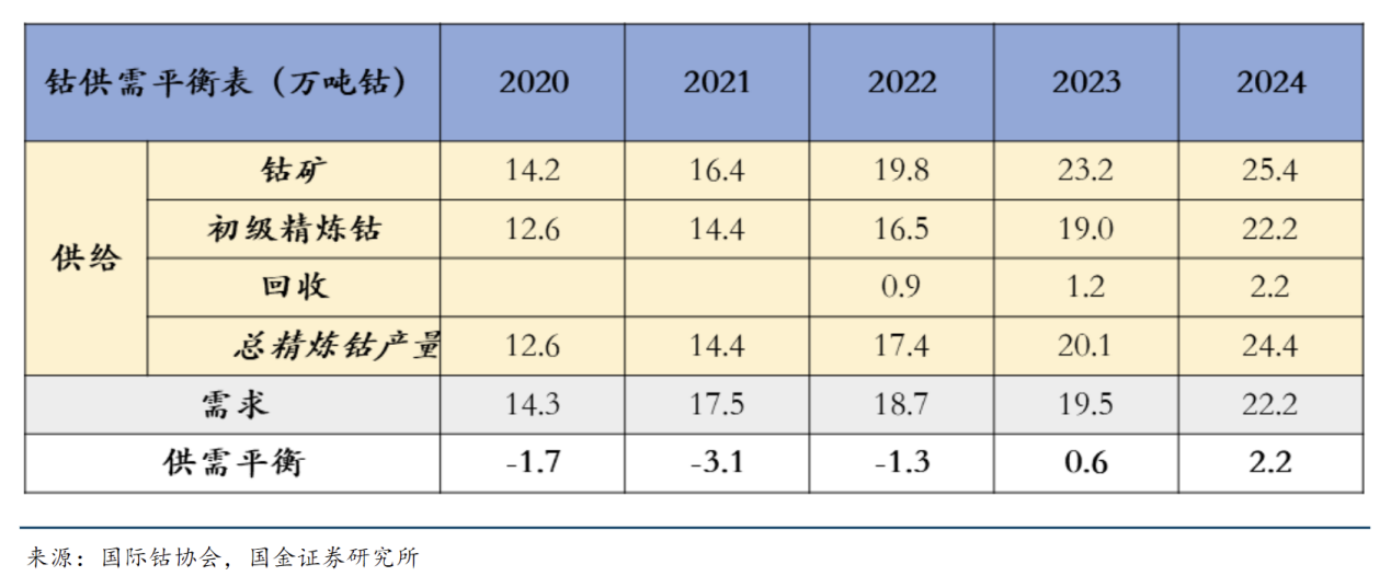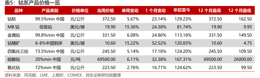 钴需求端主要集中在锂电池应用。伴随着新能源汽车的蓬勃发展,近五年钴需求量也快速增长,从2020年14.3万吨增长至2024年22.2万吨,CAGR为12%。2024年下游整体需求结构中,电动车占比已经达到43%,便携式设备占比达到30%,合金应用达到12%。未来钴的需求有望随着三元锂电池占比的增长、便携式设备的更新周期、合金应用的增长等,整体呈现稳步抬升的态势。