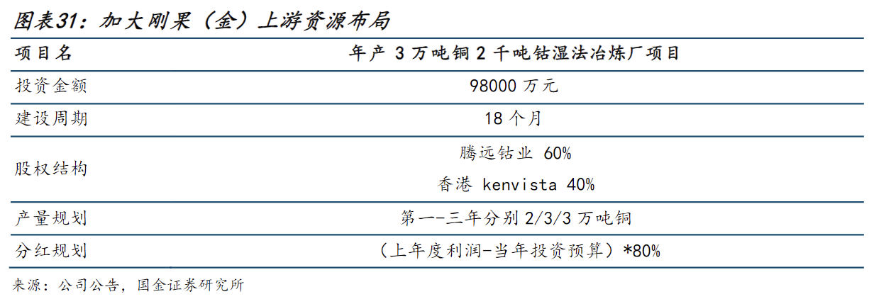公司计划再扩产3万吨铜及2000吨钴中间品。公司拟充分利用自身的技术优势以及SAWASAWA集团在刚果(金)的资源优势,与其共同投资建设3万吨铜及2000吨钴的湿法冶炼厂项目,总投资规模达9.8亿元,其中公司持有60%权益。该项目预计将于2026Q4投产,2027-29年分别贡献铜产量2/3/3万吨。