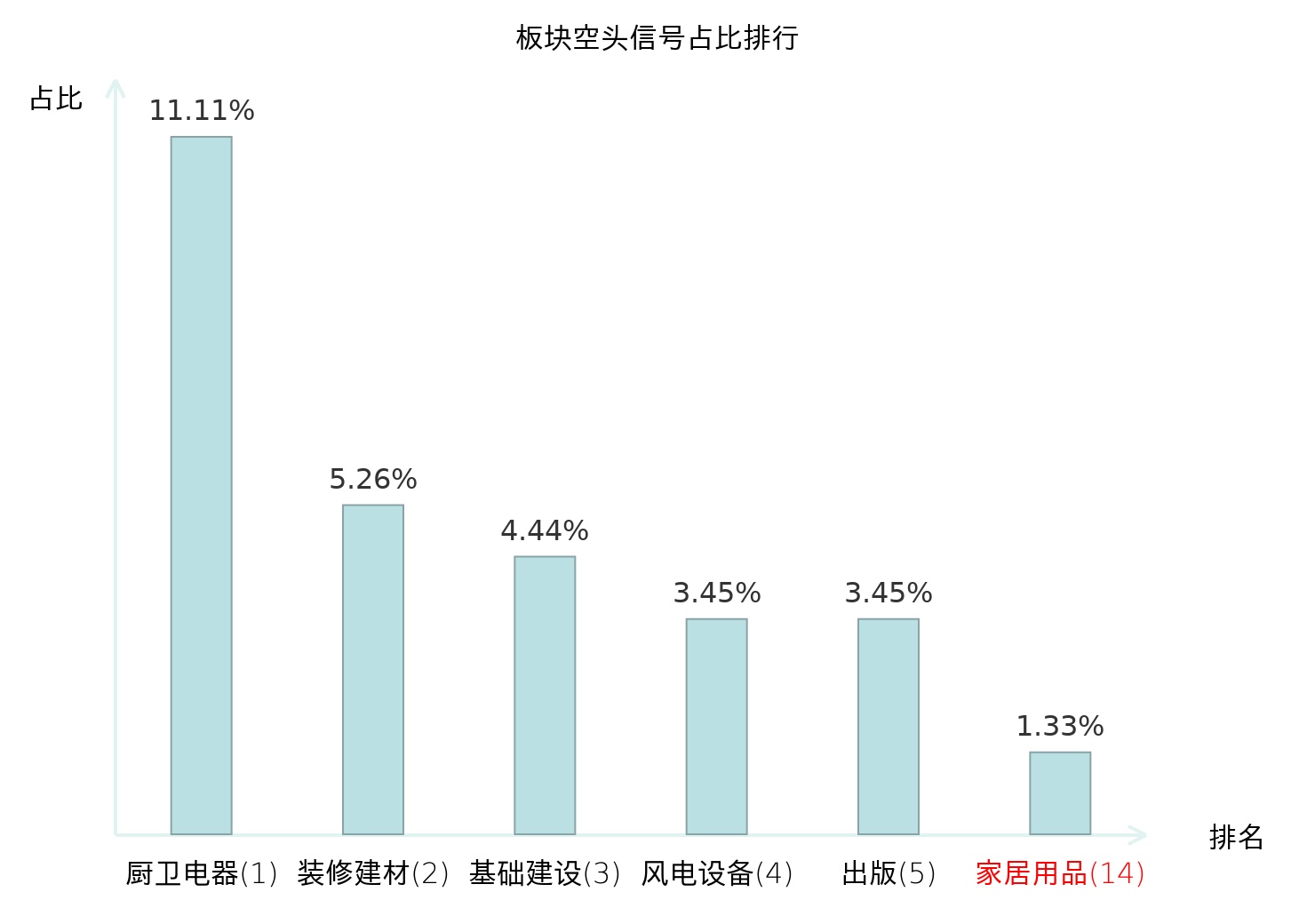 全市场所有行业板块中主力空头信号占比排名中,厨卫电器板块位居第一。塑料板块名次提升最快,较昨日上升121位。