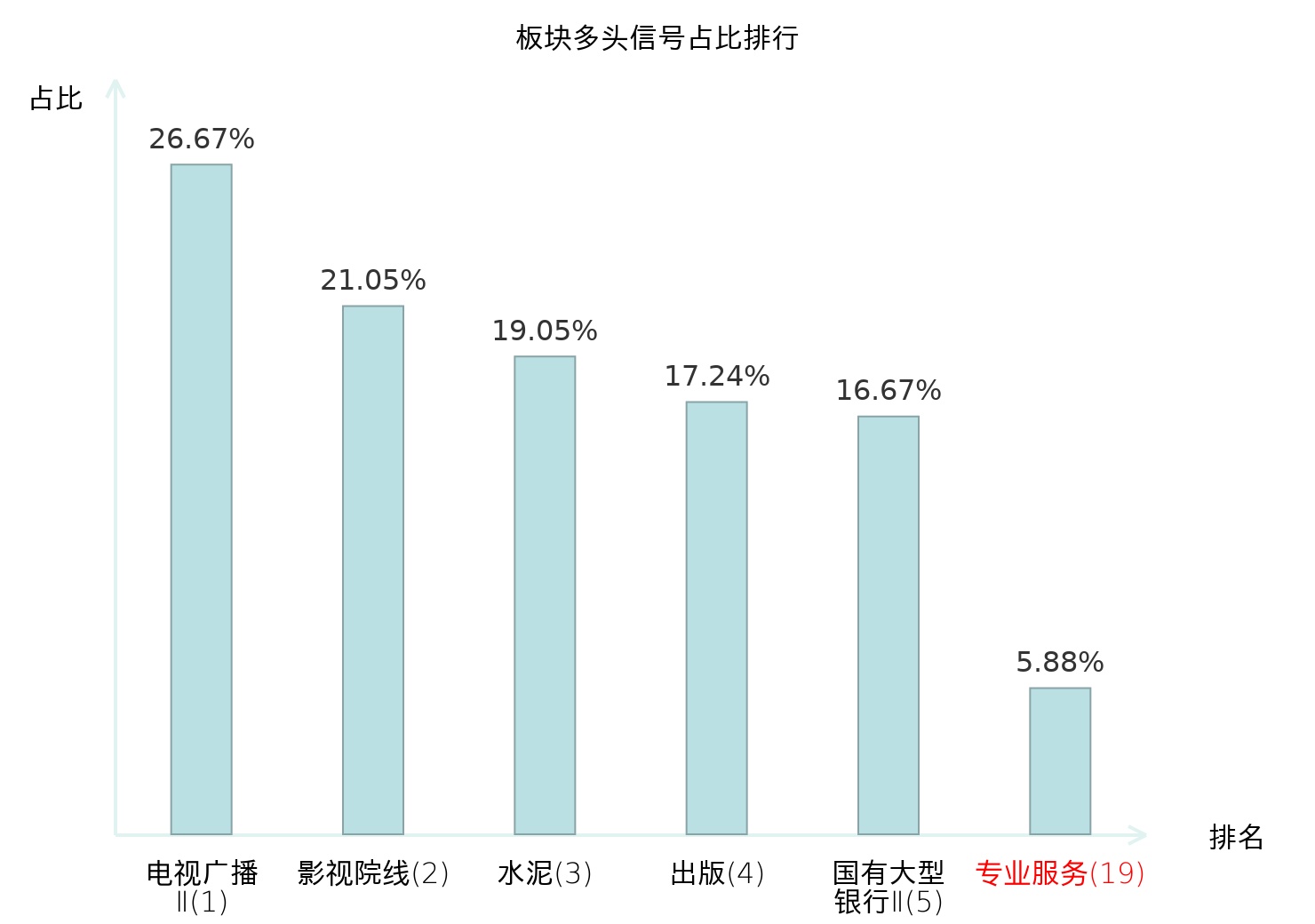 全市场所有行业板块中主力多头信号占比排名中,电视广播Ⅱ板块位居第一。国有大型银行Ⅱ板块名次提升最快,较昨日上升118位。