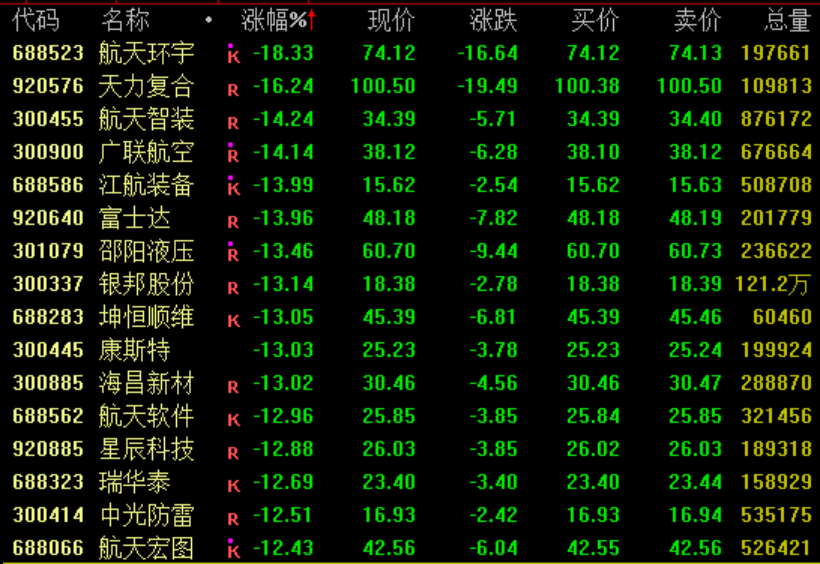 商业航天概念盘中大幅下挫,截至收盘,航天环宇跌超18%,邵阳液压跌超13%,铂力特、信维通信等跌超10%,中国卫通、航天发展、江顺科技等跌停。