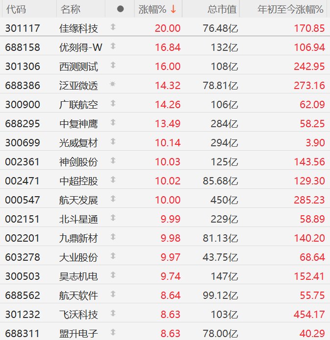 A股市场商业航天股走强,其中,佳缘科技20CM涨停,西测测试涨超18%,广联航空、中复神鹰涨超15%,泛亚微透涨超14%,光威复材涨超12%,盟升电子涨近12%,航天软件涨超10%,神剑股份(7连板)、中超控股、航天发展、北斗星通、九鼎新材、大业股份10CM涨停,昊志机电、邵阳液压涨超9%,通宇通讯涨超8%。