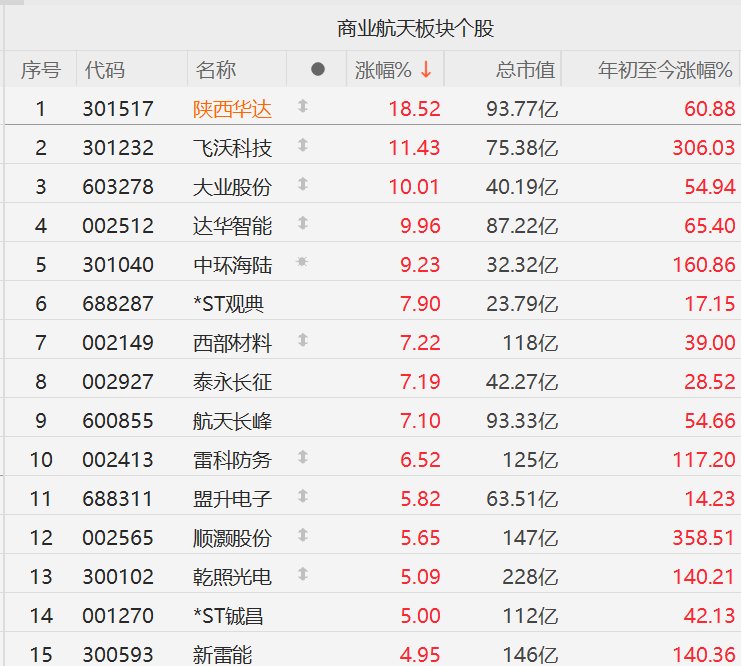 A股市场商业航天板块继续活跃,其中,陕西华达涨超18%,飞沃科技涨超11%,大业股份、达华智能10CM涨停,中环海陆涨超9%,西部材料、泰永长征、航天长峰涨超7%,雷科防务涨超6%,盟升电子、顺灏股份、乾照光电涨超5%。