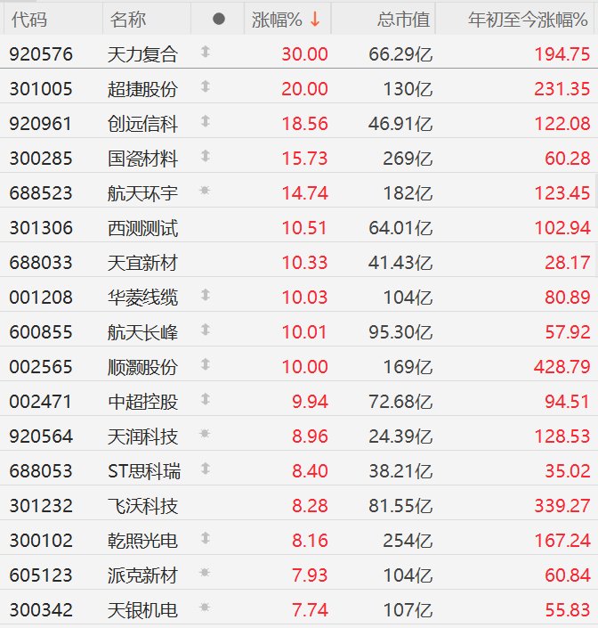 A股市场商业航天股再度集体爆发,其中,天力复合30CM涨停,超捷股份20CM涨停,创远信科涨超18%,国瓷材料涨超15%,航天环宇涨近15%,西测测试、天宜新材涨超10%,华菱线缆、航天长峰、顺灏股份、中超控股10CM涨停,天润科技、飞沃科技、乾照光电涨超8%,派克新材、天银机电涨超7%。