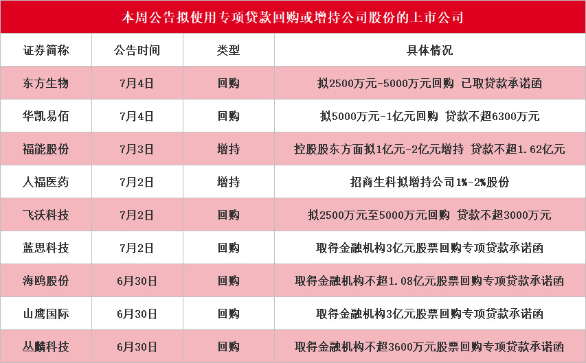 此外,蓝思科技、海鸥股份、山鹰国际本周均公告取得金融机构股票回购专项贷款承诺函。