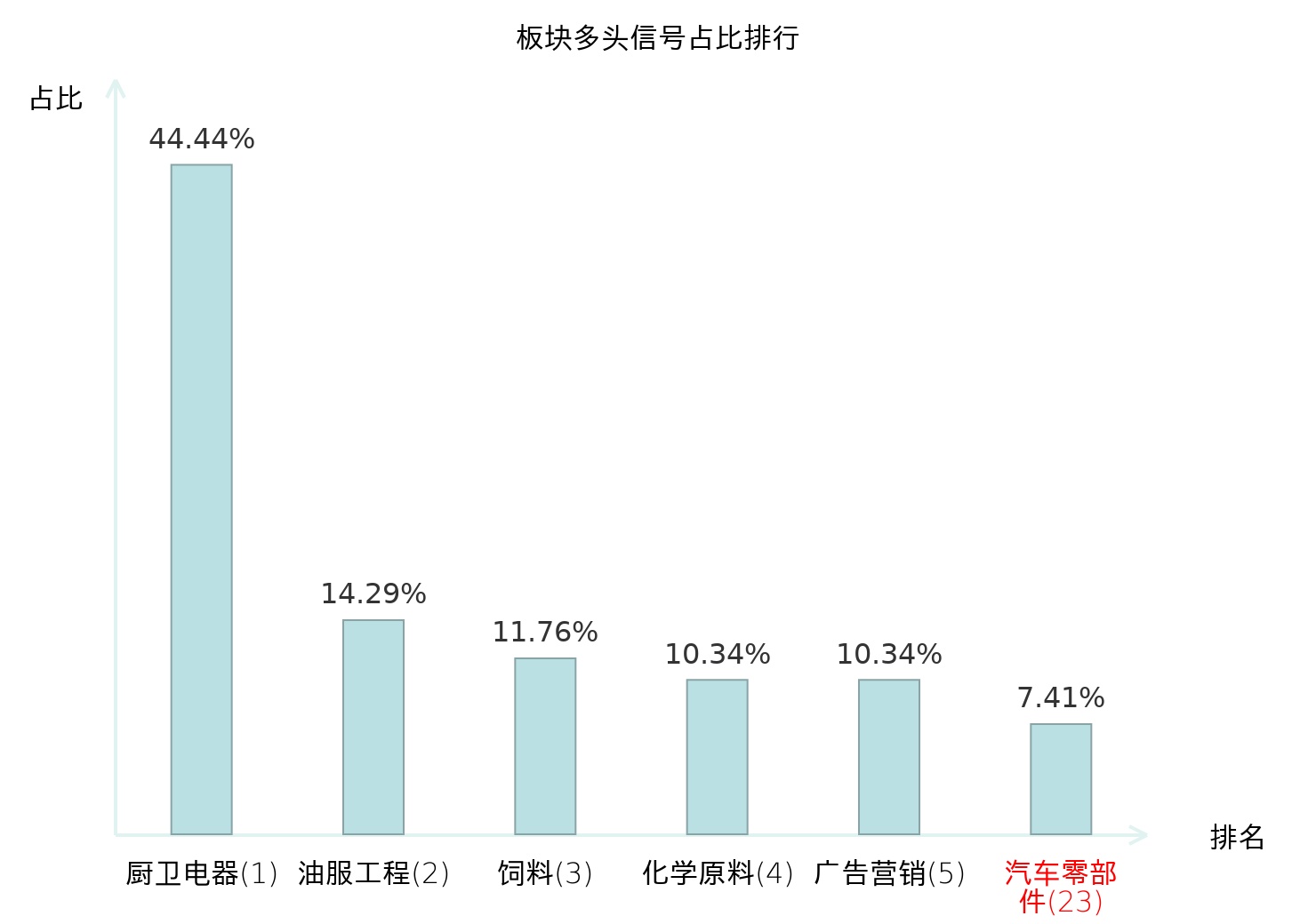 全市场所有行业板块中主力多头信号占比排名中,厨卫电器板块位居第一。厨卫电器板块名次提升最快,较昨日上升114位。