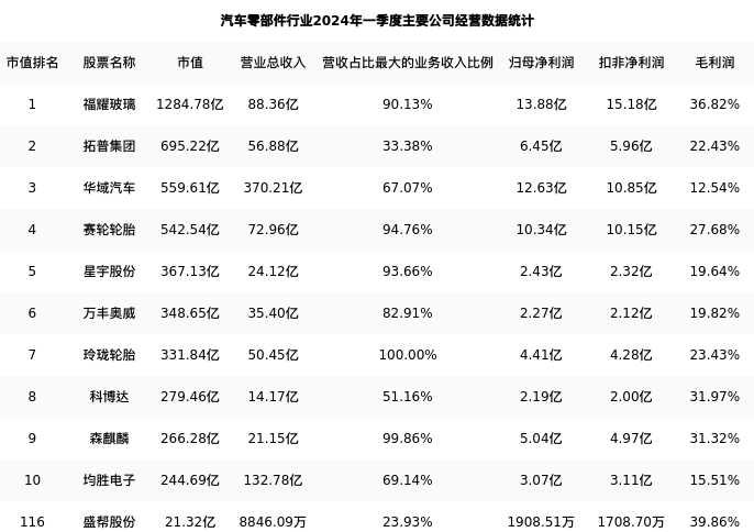 盛帮股份最新报告期数据为一季度,下表汇总了汽车零部件行业内市值靠前的公司一季度主要经营数据