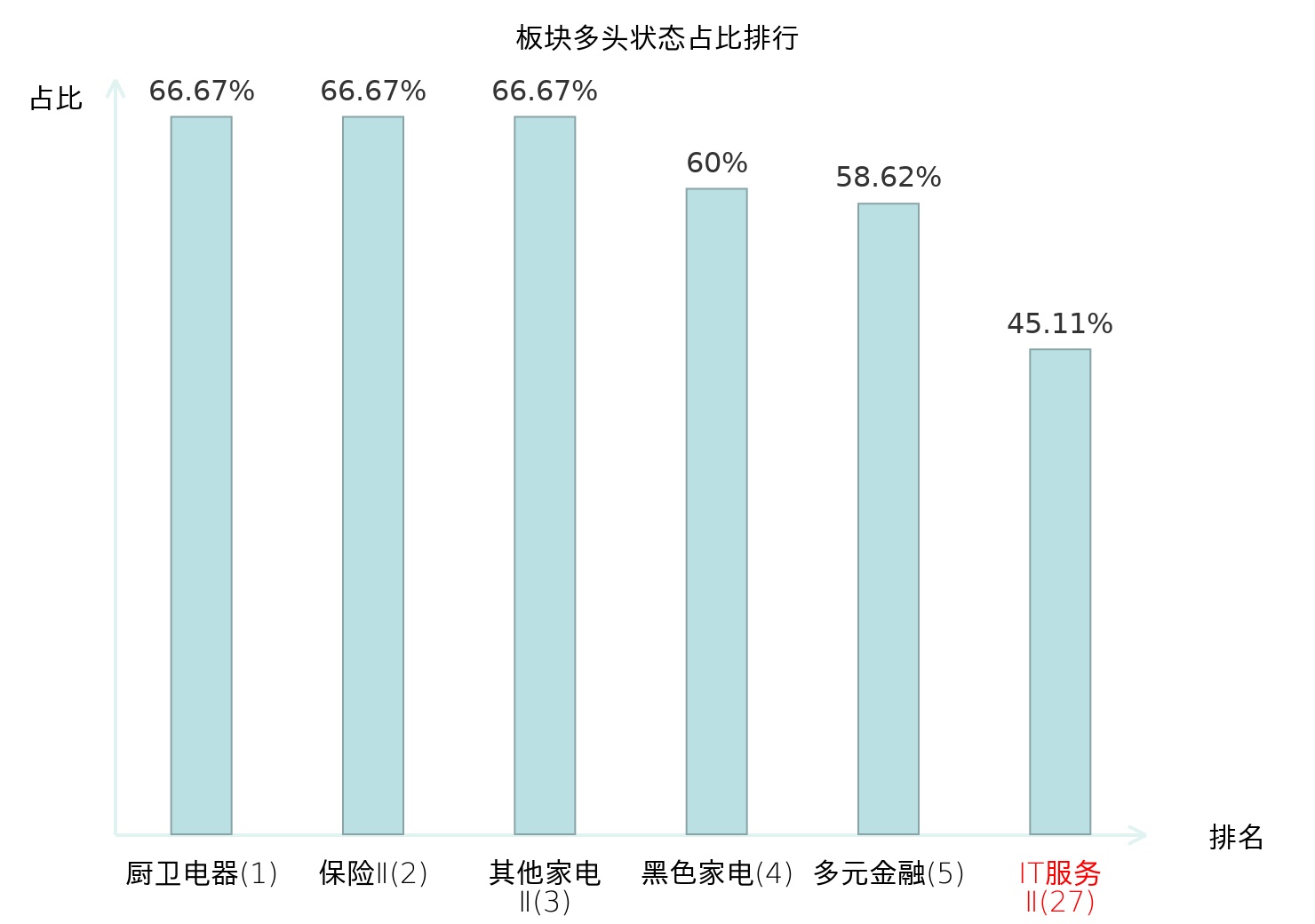 全市场所有行业板块中主力多头状态占比排名中,厨卫电器板块位居第一。其他家电Ⅱ板块名次提升最快,较昨日上升56位。