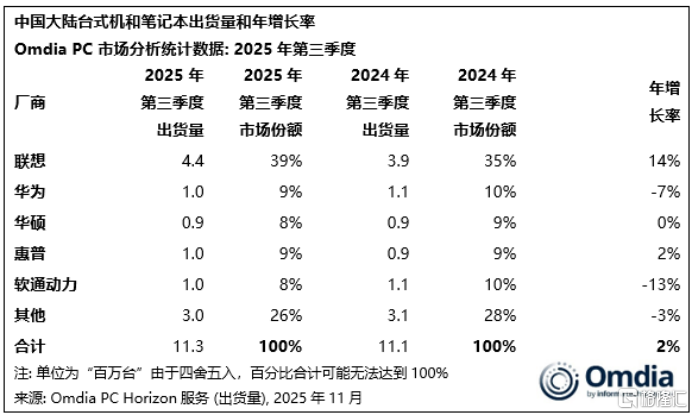 Omdia 最新监测数据显示,2025 年第三季度中国 PC 市场(含台式机、笔记本及工作站)总出货量达1130万台,同比增长2%。在此背景下,联想以440万台的出货量、39%的市场份额稳居行业第一,同比增速更达14%,远超市场整体增长水平,成为拉动行业增长的关键力量。