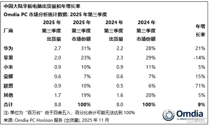 而联想在平板领域的表现同样抢眼,成为其另一大增长引擎。Omdia 数据显示,2025 年第三季度联想在中国市场的平板出货量达90万台,同比激增71%,市场份额提升至 10%,增速在头部厂商中位居前列。
