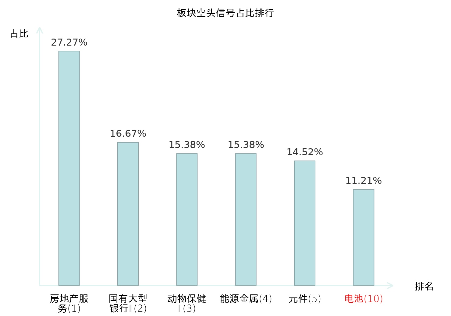 全市场所有行业板块中主力空头信号占比排名中,房地产服务板块位居第一。元件板块名次提升最快,较昨日上升122位。