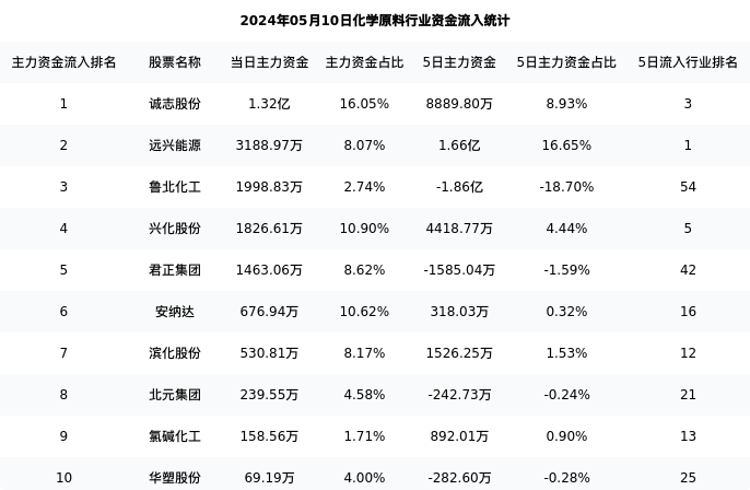 从主力资金流向来看,化学原料行业今日主力资金流入24.70亿元,在所有申万二级行业中排名:119/131。
