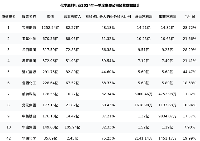 华融化学最新报告期数据为一季度,下表汇总了化学原料行业内市值靠前的公司一季度主要经营数据