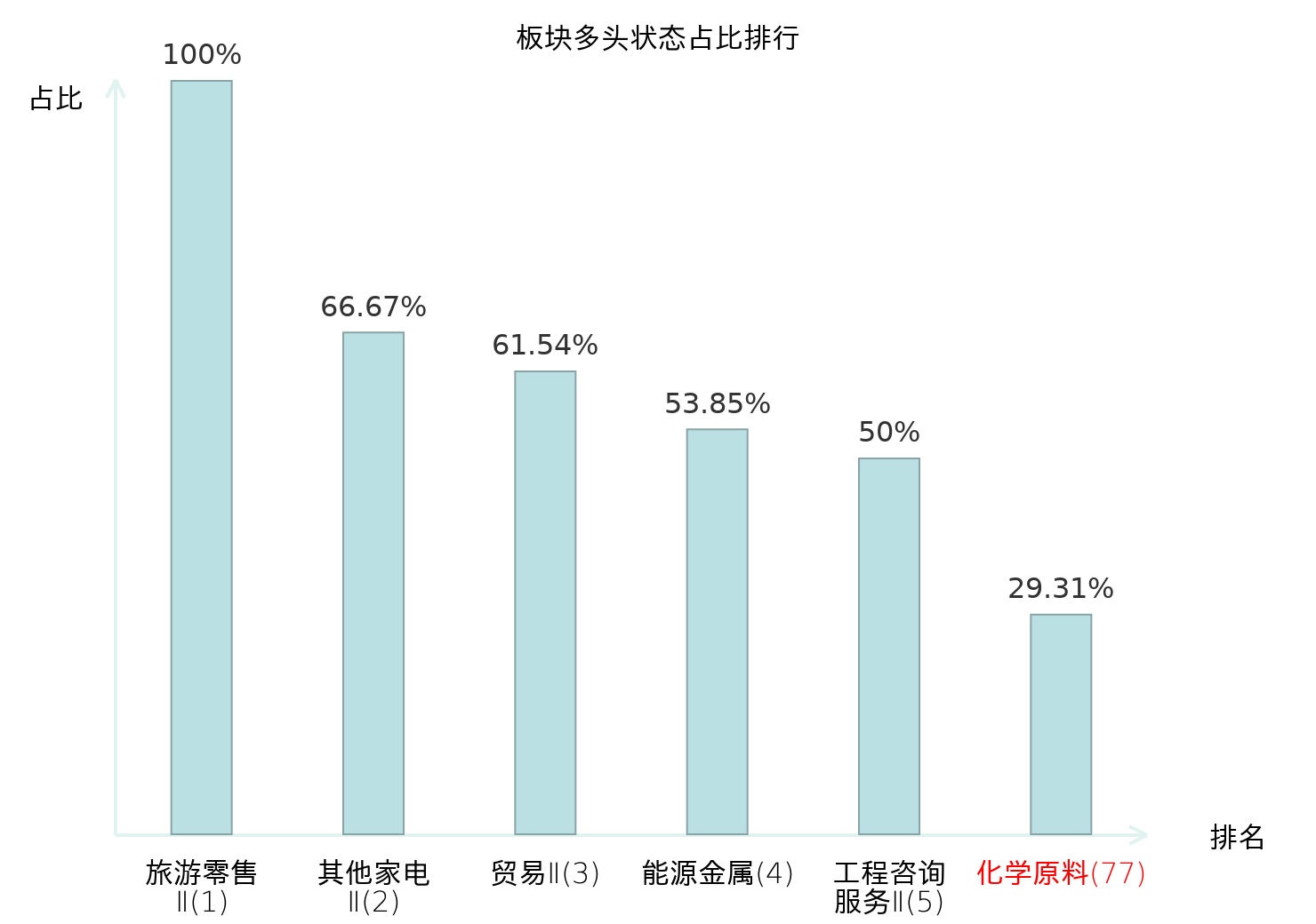 全市场所有行业板块中主力多头状态占比排名中,旅游零售Ⅱ板块位居第一。冶钢原料板块名次提升最快,较昨日上升37位。