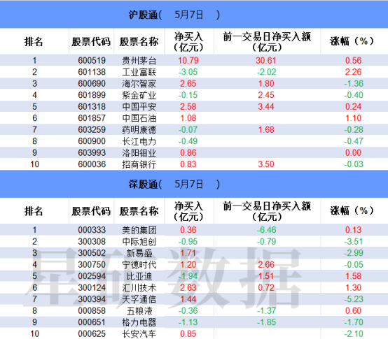 沪深股通两市前十大成交中净卖出个股数量居多,买入方面,贵州茅台净买入居首,继续获大幅净买入超10亿;海尔智家和汇川技术净买入分居二、三位。