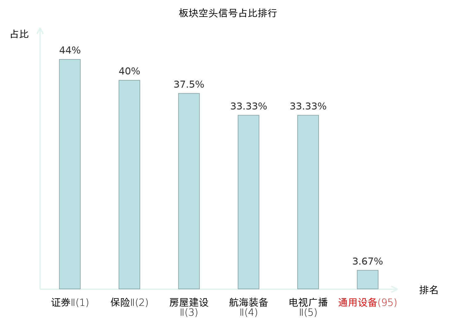 全市场所有行业板块中主力空头信号占比排名中,证券Ⅱ板块位居第一。证券Ⅱ板块名次提升最快,较昨日上升125位。