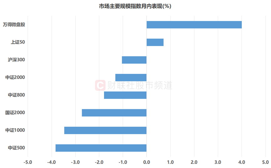 本月以来,市场整体维持震荡态势,截至今日收盘,不计算月内新股,个股月内平均仅下跌0.07%。不过,若以规模指数统计,微盘股、超级大盘在月内行情中相对占优。具体数据上看,万得微盘股、上证50指数本月唯二收涨,涨幅分别达4.0%、0.7%,而中证500、中证1000、中证2000指数跌幅明显,中证800、中证2000、沪深300指数跌幅也均超1%。