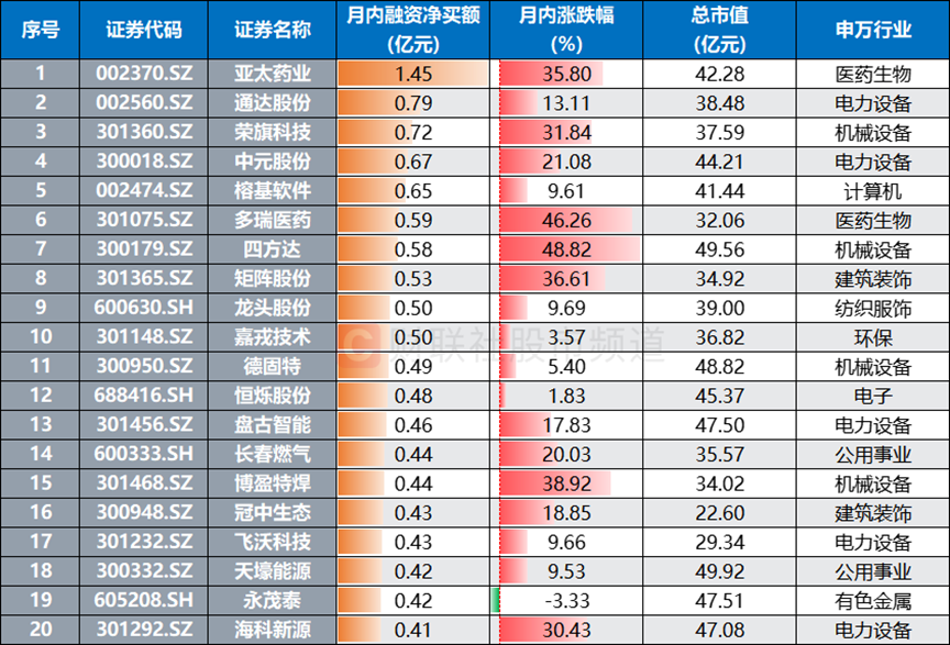注:月内融资净买额居前且总市值不足50亿元股(融资余额截至10月21日,涨跌幅截至10月22日)
