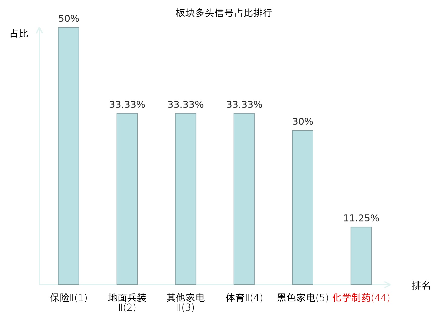 全市场所有行业板块中主力多头信号占比排名中,保险Ⅱ板块位居第一。其他家电Ⅱ板块名次提升最快,较昨日上升126位。