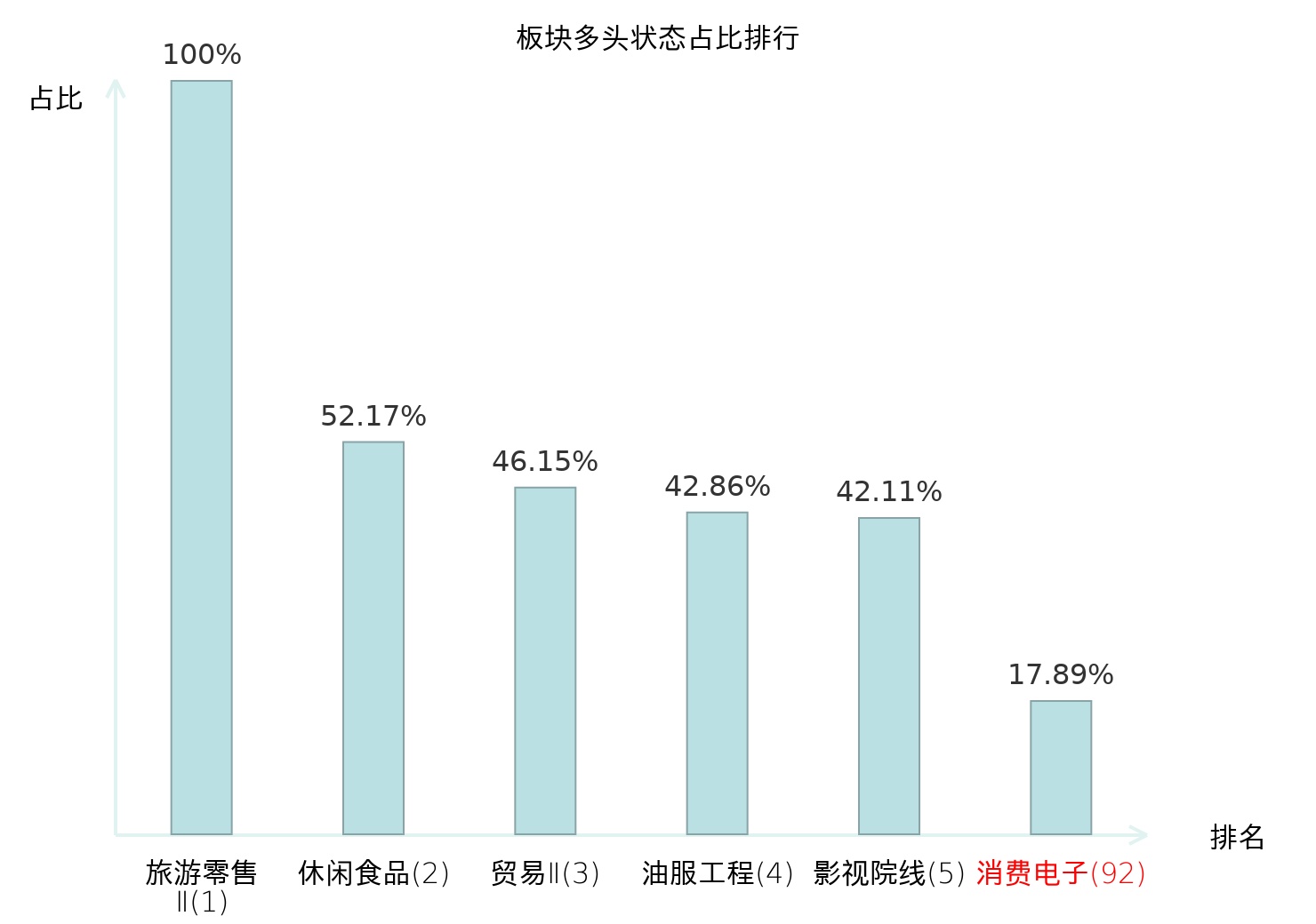 全市场所有行业板块中主力多头状态占比排名中,旅游零售Ⅱ板块位居第一。体育Ⅱ板块名次提升最快,较昨日上升99位。