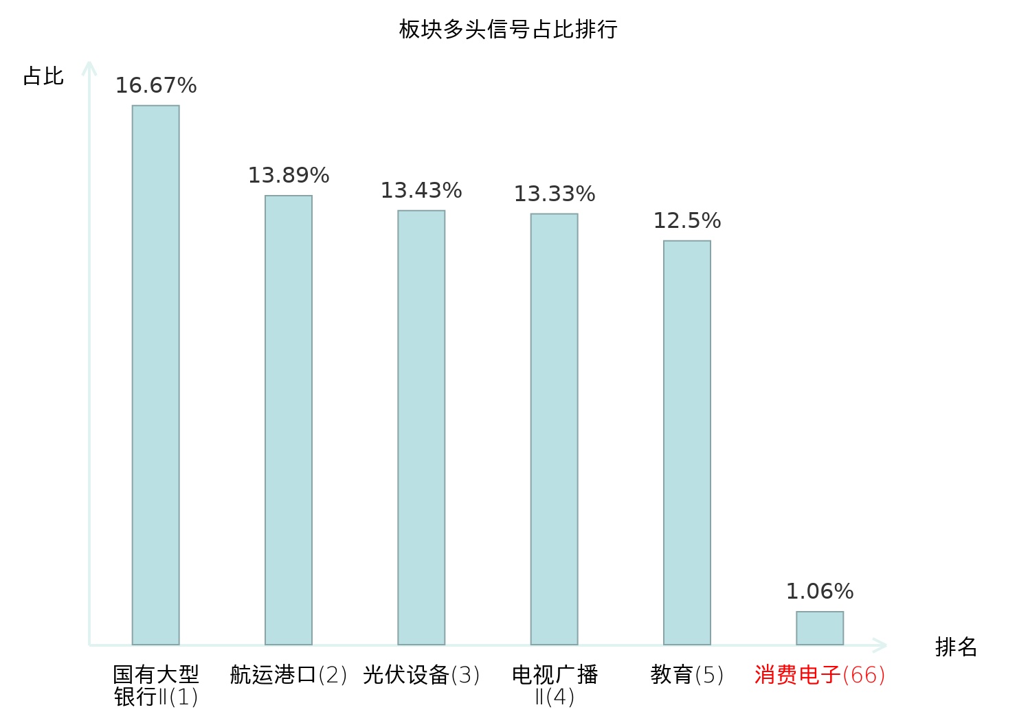 全市场所有行业板块中主力多头信号占比排名中,国有大型银行Ⅱ板块位居第一。国有大型银行Ⅱ板块名次提升最快,较昨日上升124位。