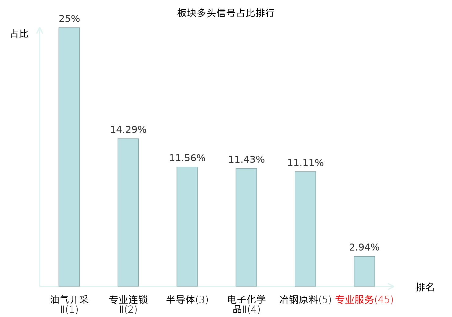 全市场所有行业板块中主力多头信号占比排名中,油气开采Ⅱ板块位居第一。油气开采Ⅱ板块名次提升最快,较昨日上升127位。