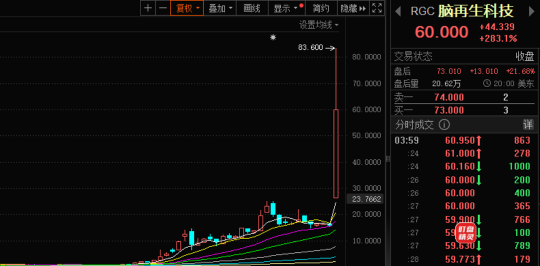 昨晚,美股脑再生科技一度大涨超400%,收盘依然大涨超283%。
