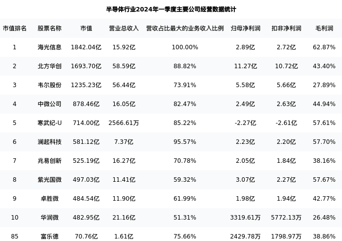 富乐德最新报告期数据为一季度,下表汇总了半导体行业内市值靠前的公司一季度主要经营数据