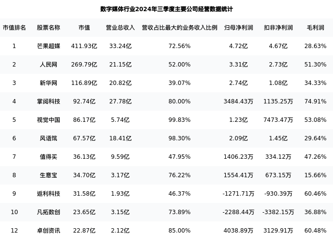 卓创资讯最新报告期数据为三季度,下表汇总了数字媒体行业内市值靠前的公司三季度主要经营数据