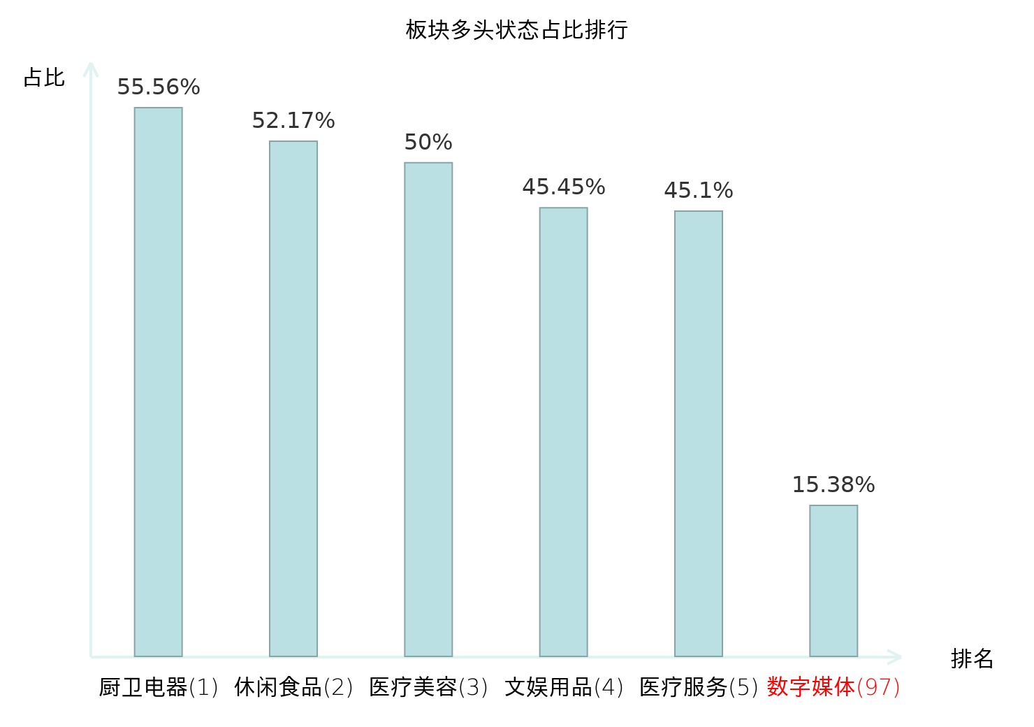 全市场所有行业板块中主力多头状态占比排名中,厨卫电器板块位居第一。林业Ⅱ板块名次提升最快,较昨日上升87位。