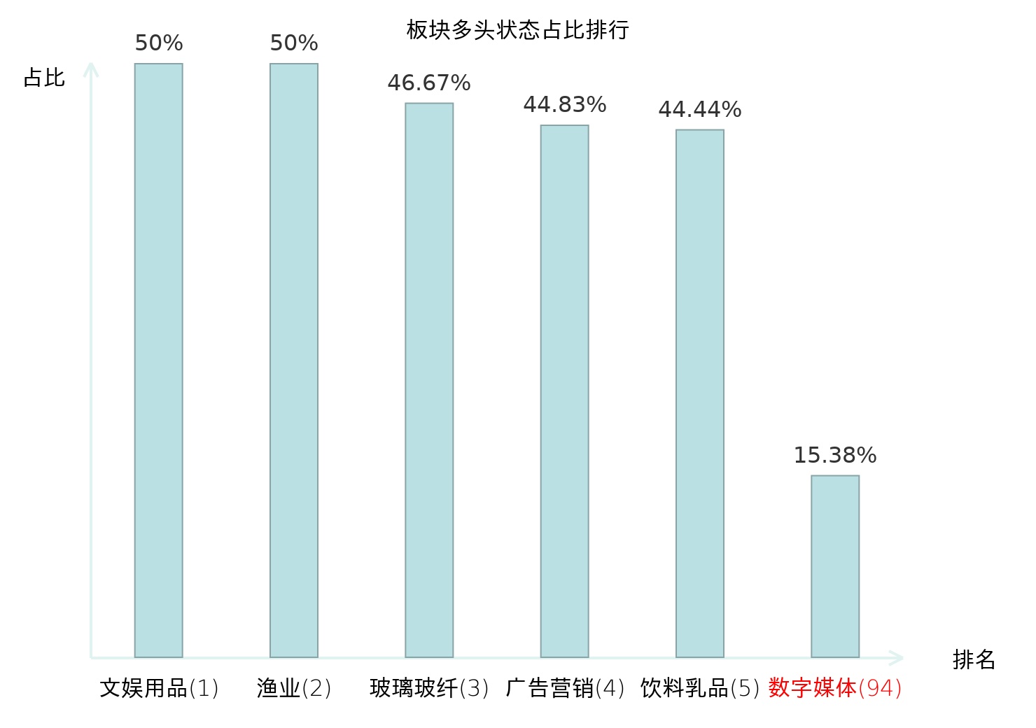 全市场所有行业板块中主力多头状态占比排名中,文娱用品板块位居第一。饮料乳品板块名次提升最快,较昨日上升59位。