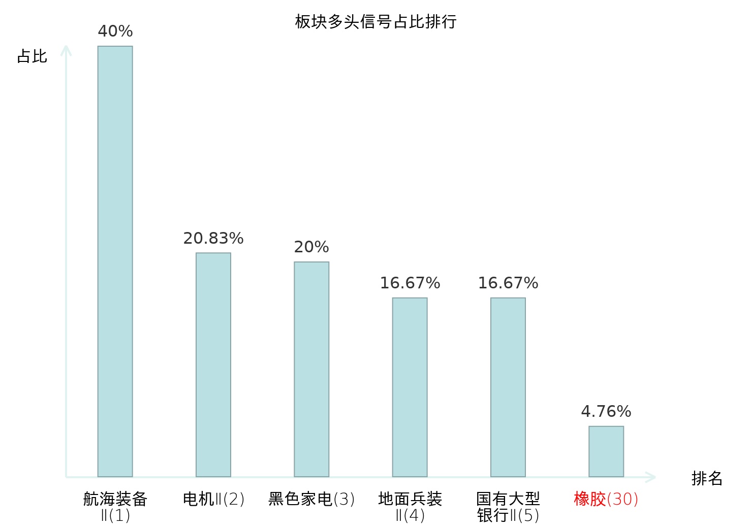 全市场所有行业板块中主力多头信号占比排名中,航海装备Ⅱ板块位居第一。国有大型银行Ⅱ板块名次提升最快,较昨日上升119位。