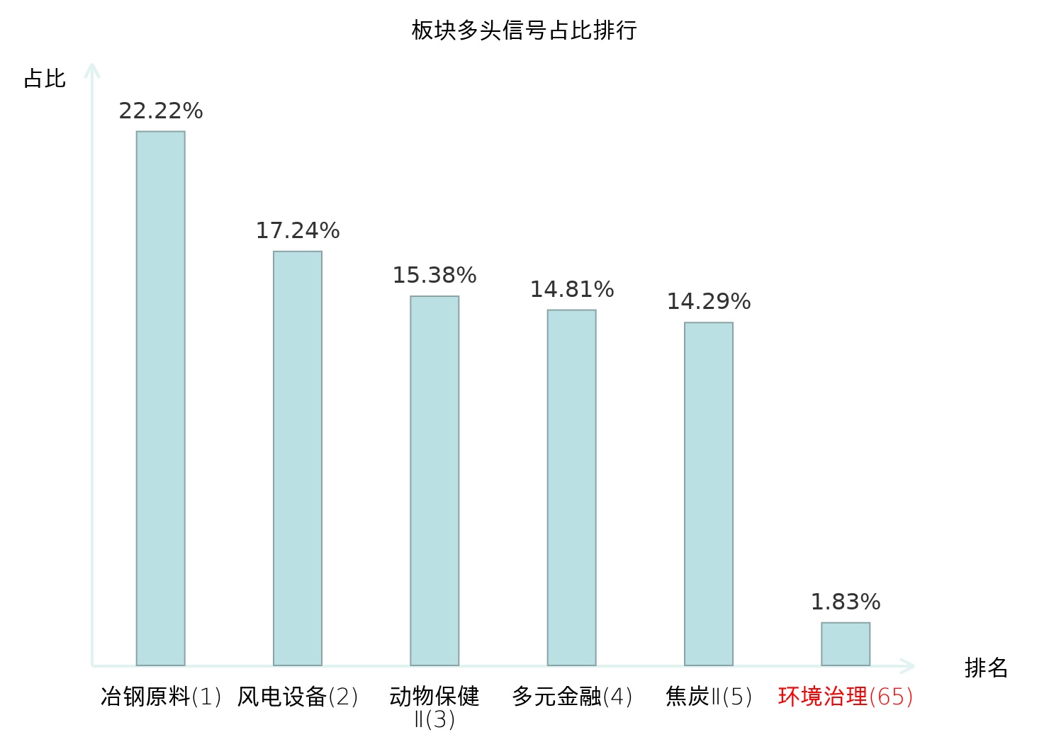 全市场所有行业板块中主力多头信号占比排名中,冶钢原料板块位居第一。冶钢原料板块名次提升最快,较昨日上升118位。