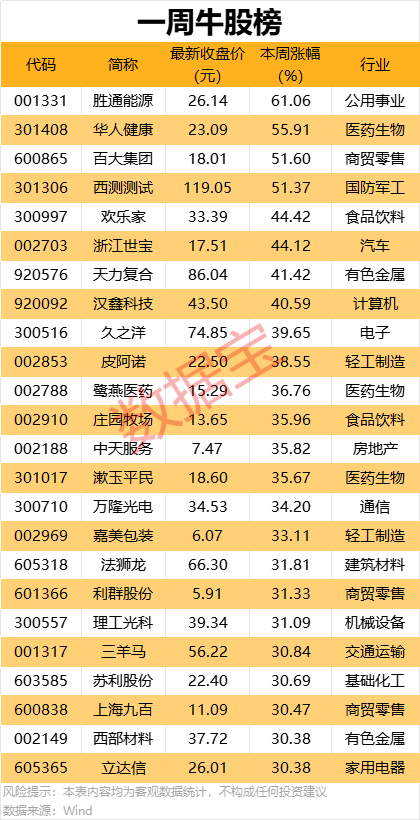 个股方面,本周超2900股上涨,24股涨幅超30%。其中,涨幅最大的是胜通能源,本周累计上涨61.06%;华人健康、百大集团、西测测试本周累计涨幅均超50%。
