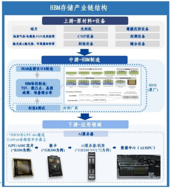 点评:由于能够打破内存墙瓶颈,HBM已成为DRAM市场增长主要驱动力。HBM解决带宽瓶颈、功耗过高以及容量限制等问题,已成为当下人工智能芯片的主流选择。当前国产HBM处于发展早期,上游设备材料或迎来扩产机遇。