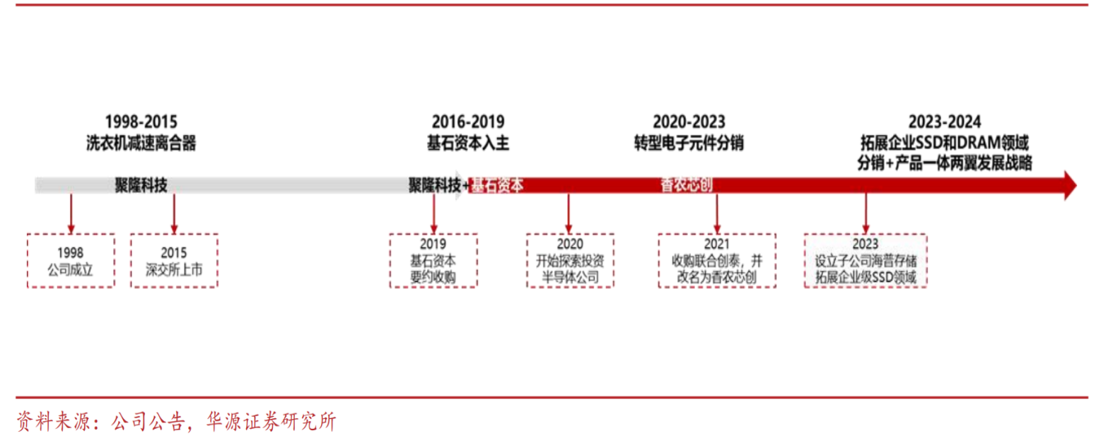 A)从传统行业转型半导体领域,成长天花板打开。香农芯创前身为聚隆科技,成立于1998年最初的主营产品为洗衣机减速离合器。2019年,基石资本完成对聚隆的要约收购,开始转型布局半导体领域,目前,公司已形成芯片分销和自研产品两大业务板块,成长天花板打开。