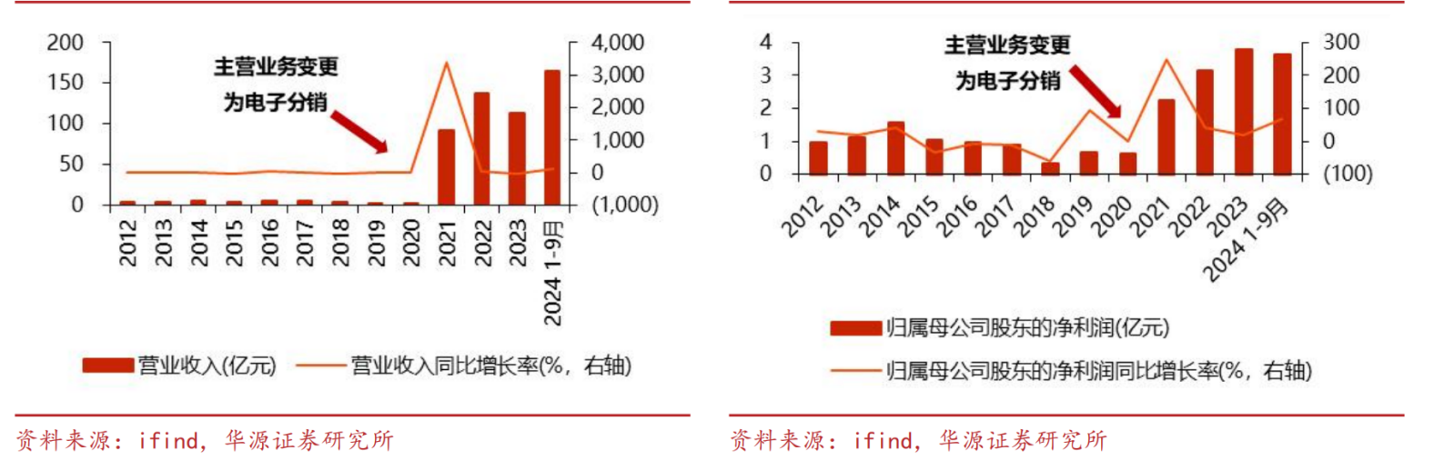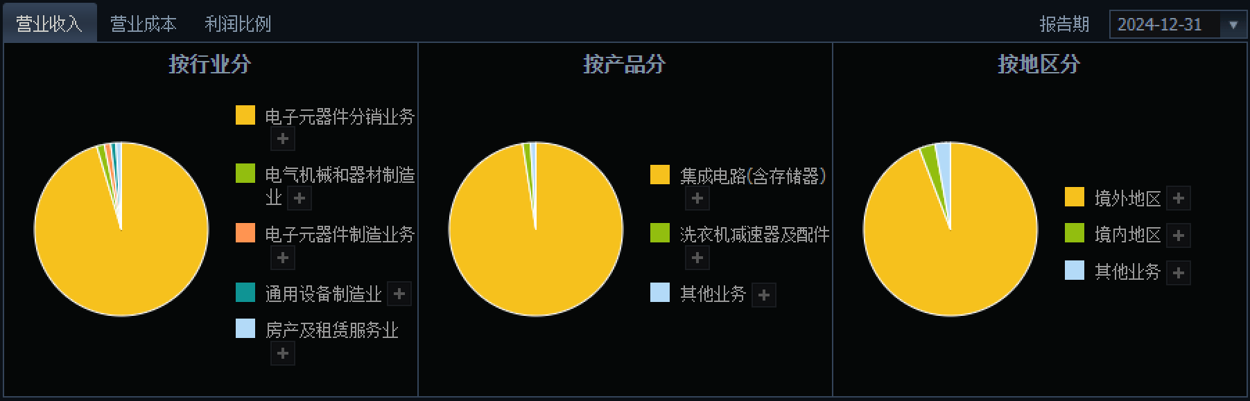 B)业务转型效果显著,构筑业绩新增长极。公司转型后发展稳健,传统业务洗衣机减速离合器收入有所收窄,高成长性的半导体业务收入逐步释放,总体呈稳健增长态势。目前,公司半导体领域主要拥有两大业务板块,主营业务为电子元器件分销业务,企业级SSD和RAM业务为公司第二发展曲线。当下分销业务系公司的收入支柱,截止2024中报该板块收入占比达到90%以上,减速器业务和自研产品占比分别为1.96%、0.01%;公司毛利率企稳回升,费用率摊薄明显。