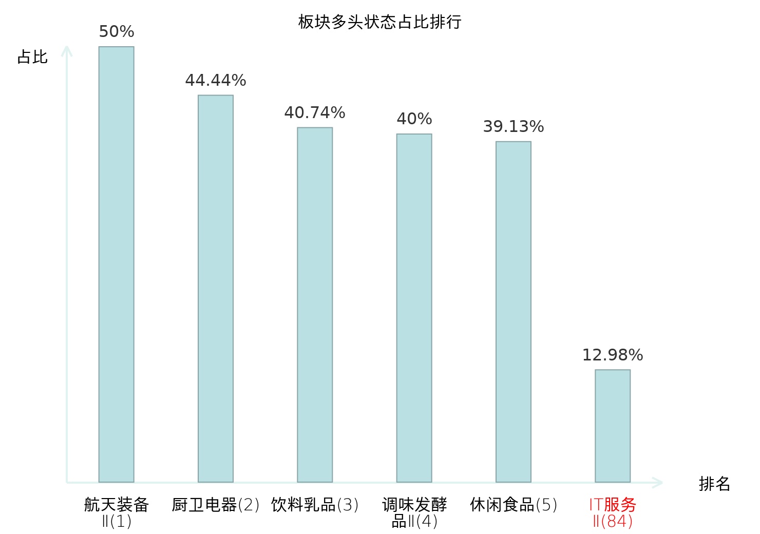 全市场所有行业板块中主力多头状态占比排名中,航天装备Ⅱ板块位居第一。林业Ⅱ板块名次提升最快,较昨日上升92位。