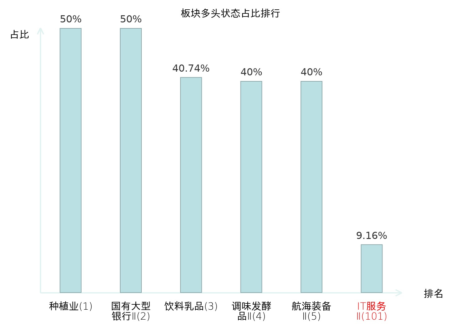 全市场所有行业板块中主力多头状态占比排名中,种植业板块位居第一。冶钢原料板块名次提升最快,较昨日上升89位。
